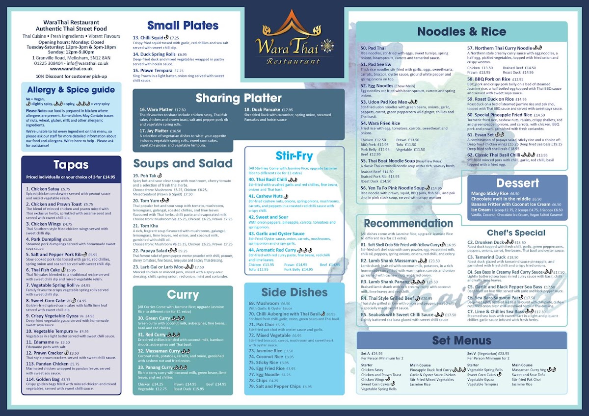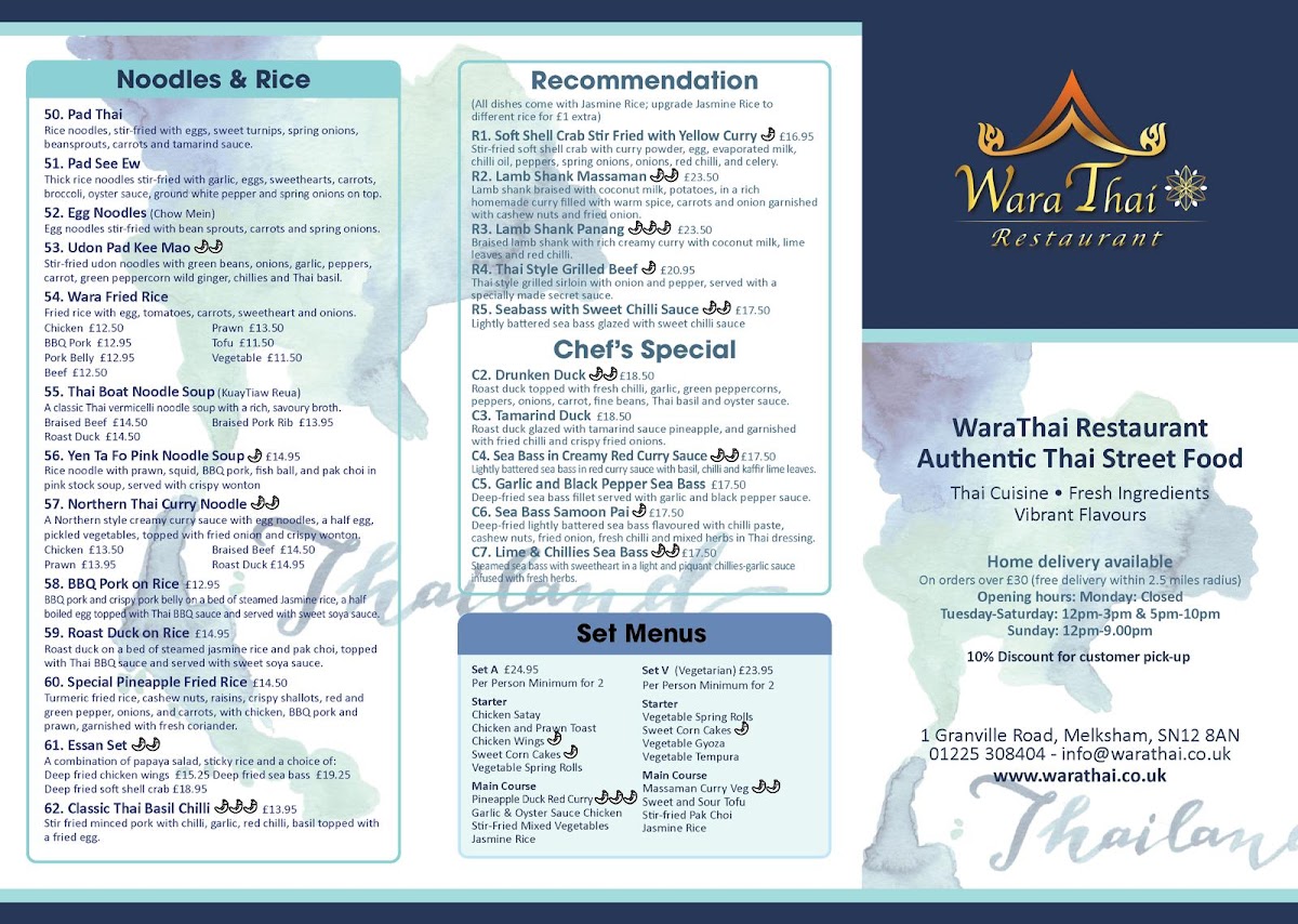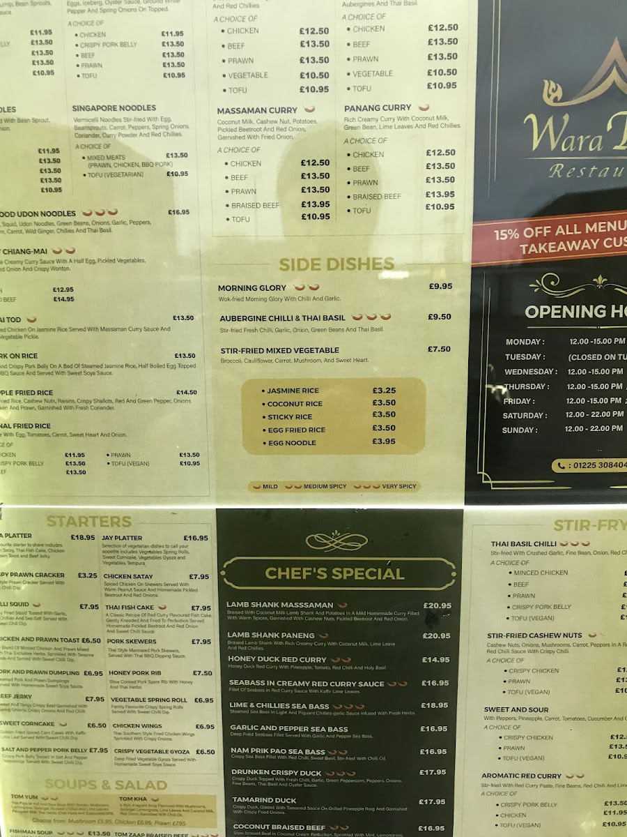 Warathai Restaurant offers a diverse and flavorful menu that showcases the richness of Thai cuisine. Starting with the appetizers, you can indulge in classic choices like Chicken Satay or Salt and Pepper Pork Belly, with the latter being a crispy delight. For something a bit different, try the Chicken and Prawn Toast or the spicy Sweet Chilli Sauce Chicken Wings. The selection of mains is equally impressive, with dishes like the aromatic Red Curry and Green Curry, or the more unique Massaman Curry and Pad Thai, each offering a balance of heat and rich flavor. The chef’s specials are a standout, with the tender Lamb Shank Massaman and Seabass in Creamy Red Curry Sauce particularly noteworthy. For those craving lighter bites, there’s a tempting array of small plates like Chilli Squid, Duck Spring Rolls, and Prawn Tempura. If you're in the mood for a soup, try the fragrant Tom Yum or the coconut-based Tom Kha. The side dishes such as Morning Glory and Aubergine Chilli & Thai Basil complement the mains beautifully. Don’t miss out on their signature dishes like the Soft Shell Crab Stir Fried With Yellow Curry or Thai Style Grilled Beef. For dessert, the Mango Sorbet and Vanilla Ice Cream provide a refreshing and sweet end to the meal. Whether you’re indulging in tapas, enjoying a hearty curry, or sharing a platter, Warathai’s menu promises an authentic and satisfying dining experience.