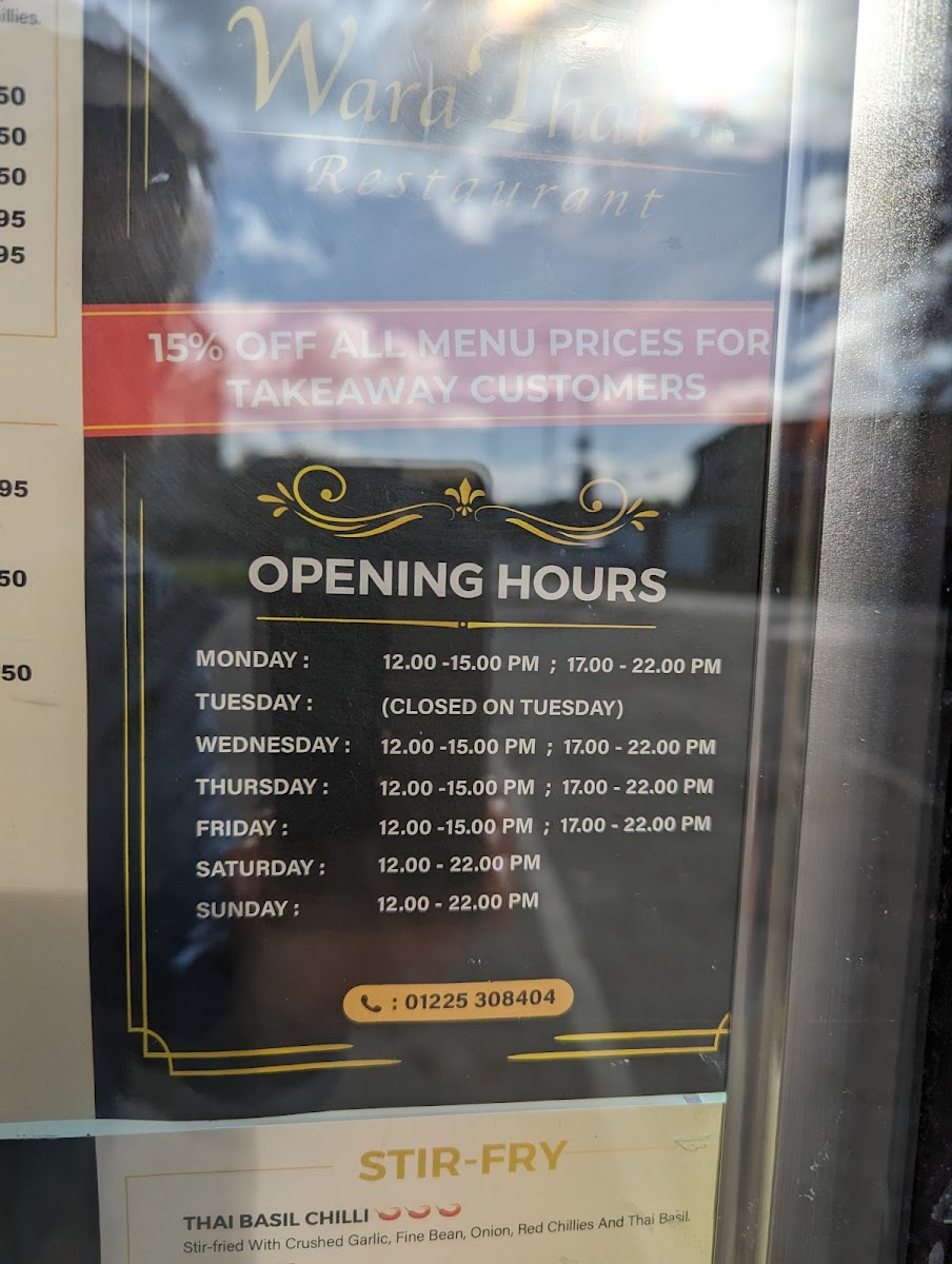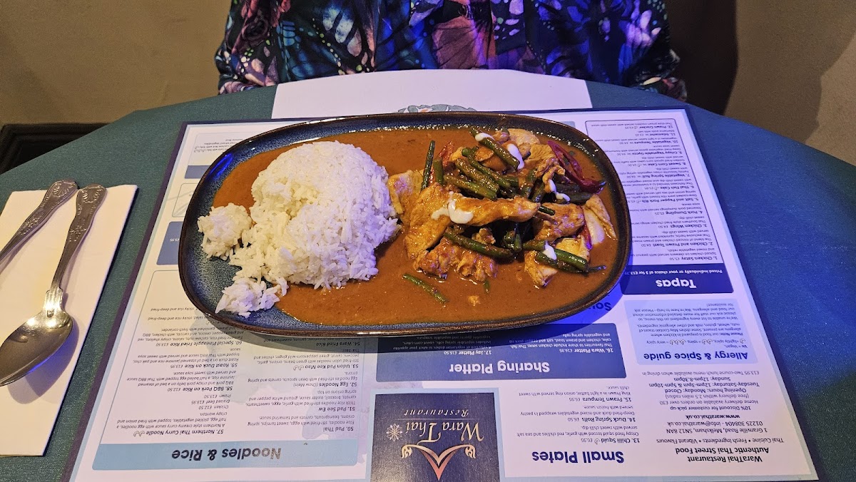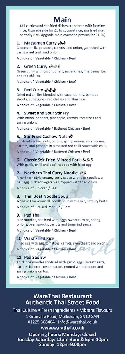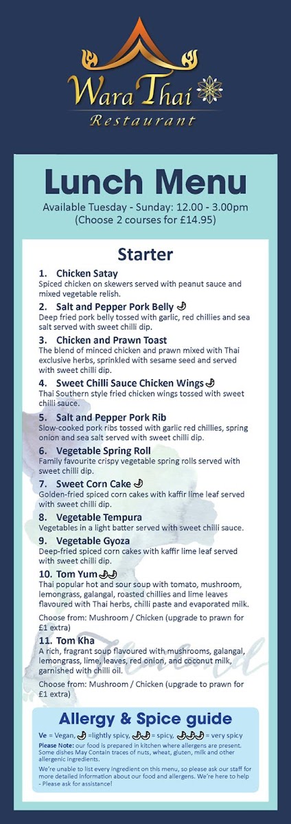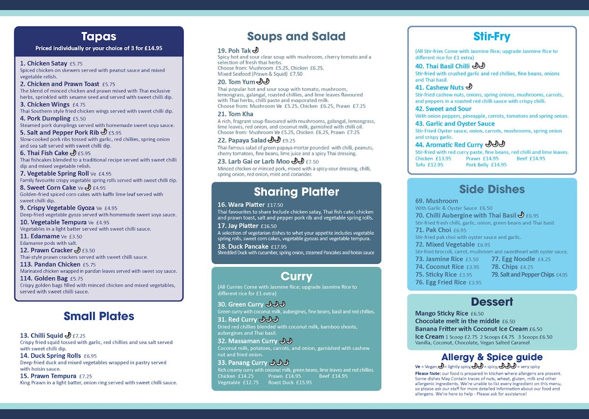 Warathai Restaurant offers a diverse and flavorful menu that showcases the richness of Thai cuisine. Starting with the appetizers, you can indulge in classic choices like Chicken Satay or Salt and Pepper Pork Belly, with the latter being a crispy delight. For something a bit different, try the Chicken and Prawn Toast or the spicy Sweet Chilli Sauce Chicken Wings. The selection of mains is equally impressive, with dishes like the aromatic Red Curry and Green Curry, or the more unique Massaman Curry and Pad Thai, each offering a balance of heat and rich flavor. The chef’s specials are a standout, with the tender Lamb Shank Massaman and Seabass in Creamy Red Curry Sauce particularly noteworthy. For those craving lighter bites, there’s a tempting array of small plates like Chilli Squid, Duck Spring Rolls, and Prawn Tempura. If you're in the mood for a soup, try the fragrant Tom Yum or the coconut-based Tom Kha. The side dishes such as Morning Glory and Aubergine Chilli & Thai Basil complement the mains beautifully. Don’t miss out on their signature dishes like the Soft Shell Crab Stir Fried With Yellow Curry or Thai Style Grilled Beef. For dessert, the Mango Sorbet and Vanilla Ice Cream provide a refreshing and sweet end to the meal. Whether you’re indulging in tapas, enjoying a hearty curry, or sharing a platter, Warathai’s menu promises an authentic and satisfying dining experience.